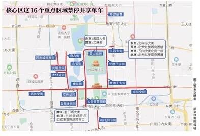 首都功能核心区的16个重点区域(包括机动车道、非机动车道、人行步道等的全路段)为互联网租赁自行车禁止停放区域。具体包括东长安街、西长安街、景山前街、府右街、西黄城根南街等路段。