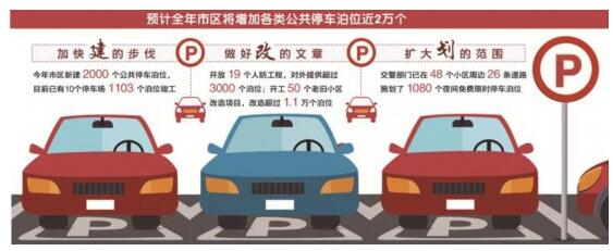 为最大限度满足停车需求,市委市政府提出在“新建建筑、人防工程、园林绿化、公司外用、城市空间见缝插针”五大领域增加停车泊位,打造一批示范项目。