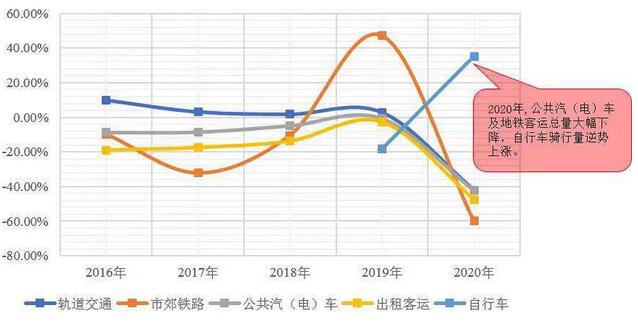 从具体数据来看,去年城市客运共运送乘客52.6亿人次,同比减少37.4%。其中,公共汽(电)车20.6亿人次,同比下降42.2%;轨道交通22.94亿人次,同比下降42.1%;公共汽(电)车及地铁客运总量43.54亿人次,同比下降42.1%;出租客运1.74亿人次,同比下降47.4%;市郊铁路0.01亿人次,同比减少60.0%,互联网租赁自行车和公共自行车骑行量达到7.3亿人次,同比上涨35.2%。