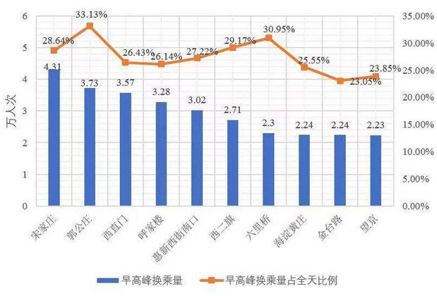 早高峰换乘量最大的前10个车站及换乘量占全天比例