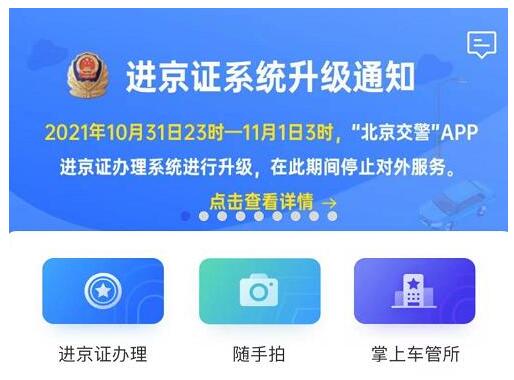 目前,北京交警APP已发出进京证系统升级通知,自10月31日23时至11月1日3时 ,“北京交警”APP进京证办理系统升级,在此期间暂停服务,11月1日3时起 ,注册用户需将APP升级到最新版后,方可正常申办。