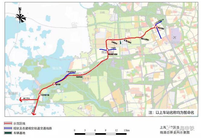 上海示范区线东起芳乐路站,西至上海市界(青浦金泽镇),主要沿北青公路、外青松公路、G50沪渝高速通道、G318沪青平公路西侧走行,线路全长约50公里。规划设置8座车站,分别为芳乐路站、徐乐北路站、赵重公路站、华青路站、青浦新城站、朱家角站、西岑站、水乡客厅站(站点名称均为暂命名)。在水乡客厅站规划向西衔接江苏省规划水乡旅游线、向南衔接浙江省规划嘉善至西塘线的条件,实现长三角市域铁路网络融合和直通运营。