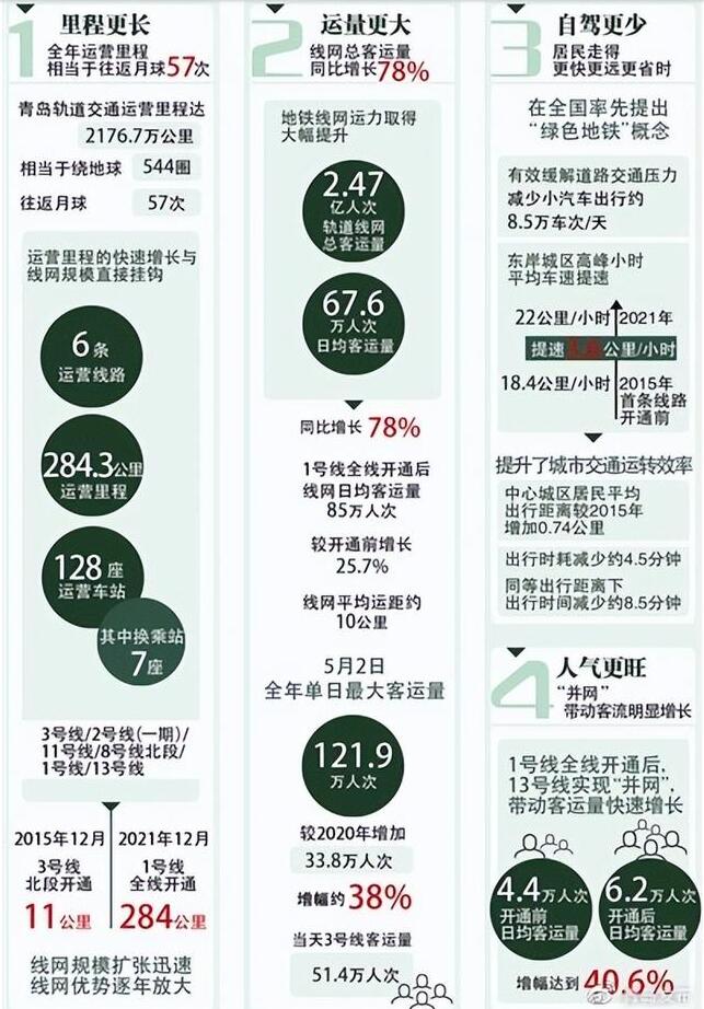 2021年,青岛地铁全年共开行列车666720列次,轨道交通运营里程达2176.7万公里,相当于绕地球544圈,往返月球57次,线网总客运量达2.47亿人次,日均客运量67.6万人次,同比增长78%。