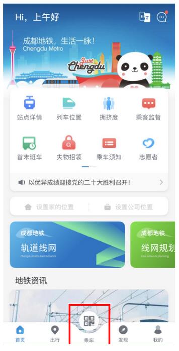 点击菜单栏中间的【乘车】按钮,首次使用二维码过闸的乘客,先绑定支付方式,即可使用二维码先乘后付。