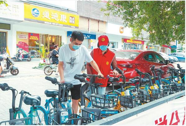 18日,在福州地铁白湖亭站,志愿者引导市民有序停放共享单车。