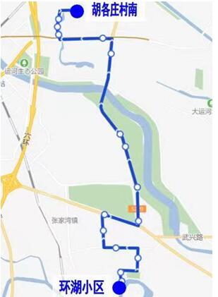 胡各庄村南→环湖小区方向增设站位:胡各庄村南、胡各庄新村西、清风路、地铁东夏园站、绿心公园东门、梁各庄村。
