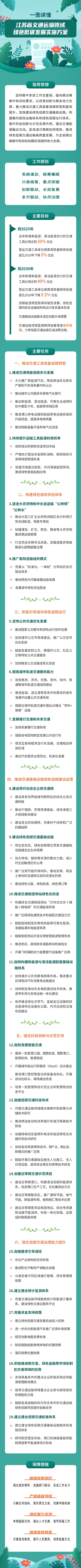 为实现以上目标,《方案》围绕稳妥有序开展全省交通运输领域碳达峰碳中和工作,提出了推动交通工具装备低碳转型、构建绿色高效货运体系、积极引导城市绿色低碳出行、推进交通基础设施绿色低碳建设运营、强化科技创新和示范引领、强化低碳交通治理能力提升等六项重点任务,包含19项具体举措。如,针对我省高度城镇化的发展特点,《方案》对绿色出行做出了更详细的规划部署,提出要坚持公共交通优先发展,提高城市轨道交通服务能力,发展慢行交通和共享交通,到2025年,城区常住人口100万以上城市绿色出行比例达到70%,全省城市轨道交通运营里程(不含S线)约1000公里。又如,《方案》提出要积极创建一批近零碳交通示范项目,力争在2025年前完成3个近零碳港口、3个近零碳服务区和8个近零碳枢纽场站的创建工作。