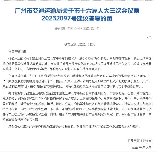 4月25日,在广州市交通运输局关于市十六届人大三次会议第20232097号建议答复的函中提到,广州明确不鼓励发展互联网租赁电动自行车(共享电动自行车),并将依据现行法律法规,进一步加强对共享电动自行车违法违规行为的监管和整治。