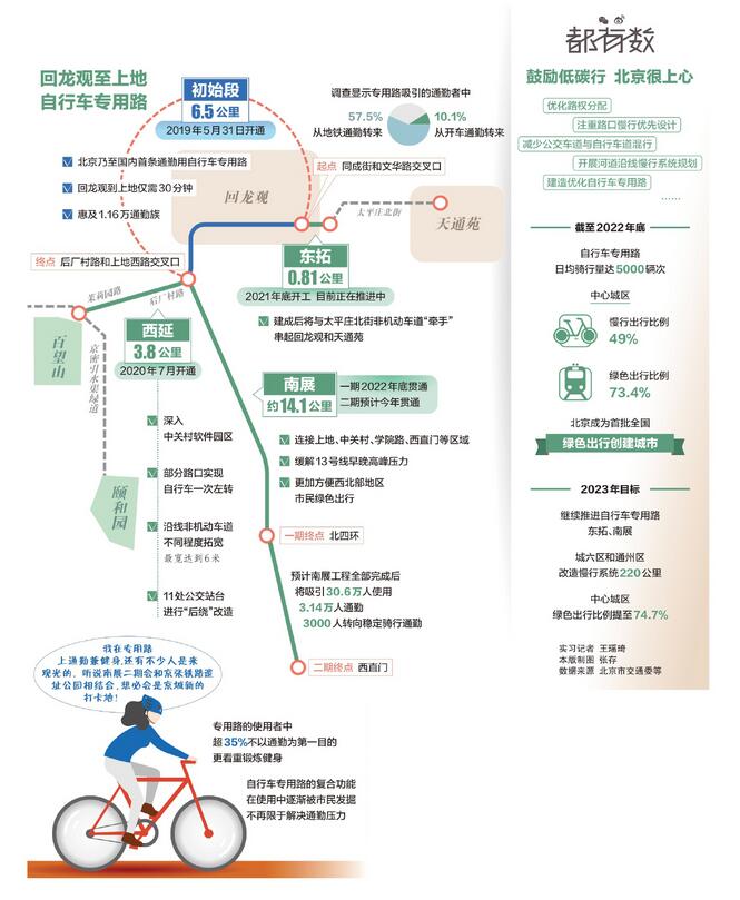 北京市首条自行车专用路今天迎来开通四周年。这条连接回龙观和上地的专用路是北京近年来践行慢行优先、绿色优先交通理念的标杆,日前发布的《2023年北京市交通综合治理行动计划》对这条路有哪些新的规划?对全市慢行系统提升、绿色出行又提出哪些新的目标?