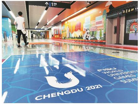 据介绍,成都大运会主题车站由成都大运会执委会和成都轨道集团联合打造,以大运会吉祥物“蓉宝”为主角,以大运会主视觉体系为基底,以成都城市地标和大运会场馆元素为内核,用2.5D设计形式植入地铁站的墙面、立柱和地面空间,立体、直观地营造半沉浸式氛围空间。