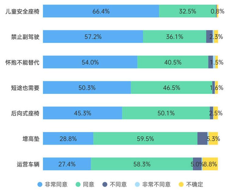人大团队的调研显示,公众对儿童安全座椅的重要性认知较之往年提升明显,儿童乘车安全得到了广泛普及。98.9%的受访者明确认同,正确使用儿童安全座椅能显著降低交通事故中儿童的伤害与死亡风险。在具体安全认知上,94.5%的受访者认可“怀抱不能替代座椅”,96.8%支持“短途也需要使用座椅”,93.3%赞成“12岁以下儿童禁止坐副驾驶”,另外对婴幼儿用的后向式座椅、大童用的增高椅等细分产品的必要性认知率也分别达到95.4%和88.3%。