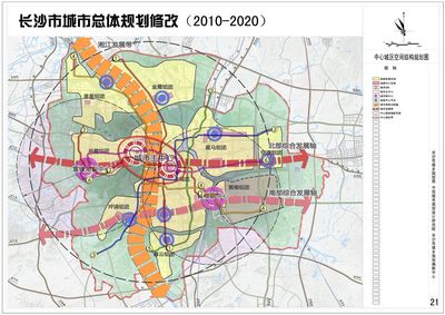 《长沙市城市总体规划修改(2010—2020)》中心城区空间结构及轨道交通规划图。(图中标有数字的线为轨道交通线网)
