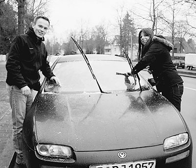 马里亚(左)和杰西卡在铲除车窗上的冰,准备“出车”。 |