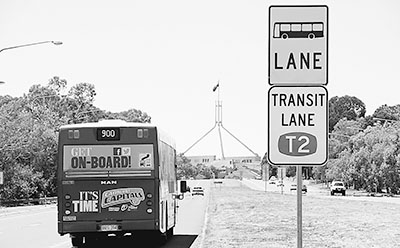 堪培拉国会山环道上的专用快车道标识。专用快车道,规定至少载2人的车辆、公共汽车、出租车和摩托车可使用。 |