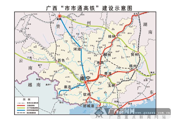 广西新闻网-广西日报南宁讯 (记者邱宜钢)5月16日,记者从自治区铁路建设办公室获悉,我区关于推动铁路建设大发展的工作方案日前已确定。根据该方案,到2020年,广西全区设区市将实现“市市通高铁”,并建成以南宁为中心的“12310”高铁经济圈:1小时通达南宁周边城市,2小时通达全区设区市,3小时通达周边省会城市,10小时左右通达国内主要中心城市。