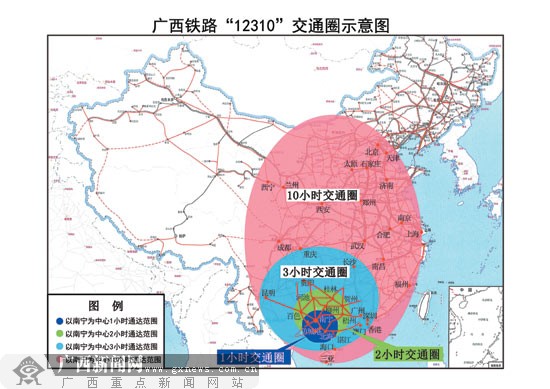 ——到2020年,建成以南宁为中心的“12310”高铁经济圈:1小时通达南宁周边城市,2小时通达全区设区市,3小时通达周边省会城市,10小时左右通达国内主要中心城市;实现全区设区市“市市通高铁”。