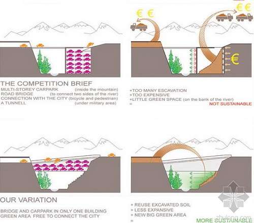 “在山间建立一座桥梁式的多层停车场”是由意大利建筑师Angelo Salamone带领的设计团队AS-DOES (Designers Of EcoSystems)提交的创新方案。该设计在莫埃纳市政府举办的Longea(意大利旅游胜地)停车场国际设计大赛中获得二等奖。