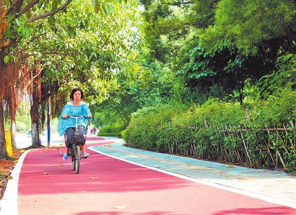 4日,市民骑自行车行驶在柳石路慢行交通系统道路上。
