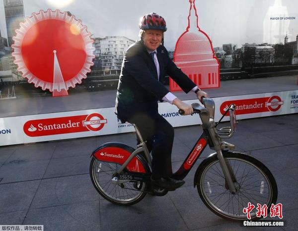 2月27日,英国伦敦,伦敦市长鲍里斯宣布,桑坦德银行将成为伦敦自行车出租行业的新赞助商,随后他亲自试骑了公租自行车,宣传绿色出行。