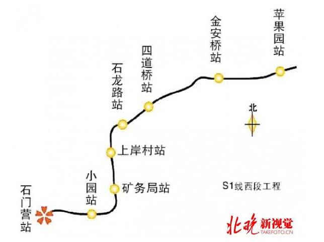 北京市中低速磁浮交通示范线(S1线)西段工程西起门头沟新城西南角的石门营站,沿京原路(规划三石路)西侧敷设,之后线路向东依次跨越京原路、莲石路至规划沙石坑西侧路路北,而后向北沿规划滨河路南延路中间敷设至规划石龙路,沿石龙路南侧布置,跨西六环、永定河后,进入首钢厂区北侧,沿既有京门铁路南侧敷设至石景山区苹果园站。