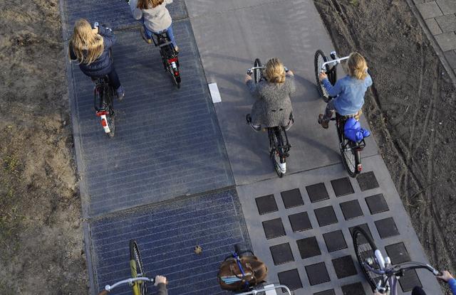 这条道路是自行车道,总长度约为70米。它在水泥板里嵌入了晶体硅太阳能电池板,可将太阳能转化成电,并输送给电网,为街灯、交通信号灯或附近民宅供电。而路面表层是可起到保护作用的玻璃,可承受12吨重消防车的重量。