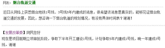 胶东在线消息烟台市发改委在本网网上民声平台回应网民最新消息:关于轨道交通的规划进展,目前,项目处于前期立项审批阶段,争取下半年开工建设1号线,计划争取5年内建成1号线,晚一年建成3号线。