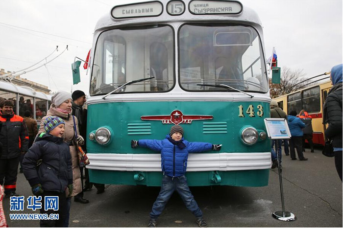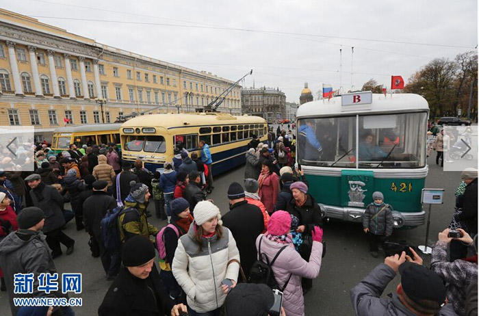 10月23日,市民在俄罗斯圣彼得堡冬宫前广场上观看老款电车。 当日,俄罗斯圣彼得堡在冬宫前广场展示11辆无轨电车,纪念该市无轨电车运行80周年。 新华社发(莫京娜 摄)