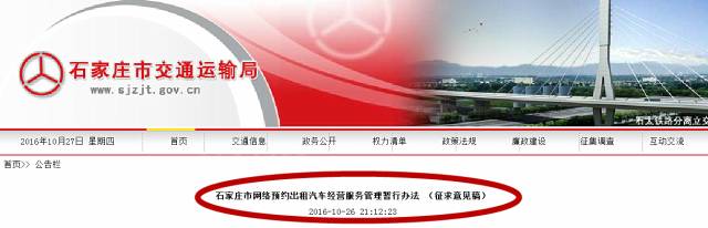 10月26日晚,石家庄市交通运输管理局发布《石家庄市网络预约出租汽车经营服务管理暂行办法》(征求意见稿)(以下简称《办法》)。公众可在2016年10月31日前,提出反馈意见。