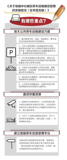 和胡先生存有相同困扰的成都市民不在少数,对于破解“停车难,难于上青天”的问题,成都也正在行动。近日,记者从成都市建委官网获悉,为鼓励和吸引社会资本参与城市停车设施建设,有效缓解中心城区停车难以及交通拥堵的问题,市建委牵头起草了《关于加强中心城区停车设施建设管理的实施意见(征求意见稿)》(以下简称《实施意见》),并面向社会公开征求意见。