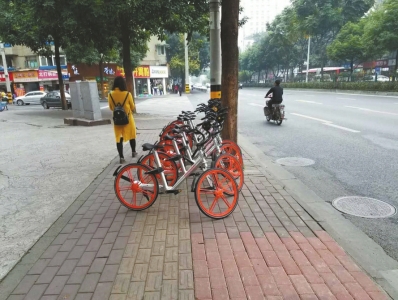 一夜之间,成都文武路上同样出现了一排排色彩鲜艳的共享单车。这些车也“抢”了城管的眼球,不过是以另一种方式——超过一半的车都未规范停放,还有三四十辆车直接停在了盲道上。城管执法人员花了一个多小时才把这些车移开。除此之外,还有读者反映有共享单车被损坏的情况。
