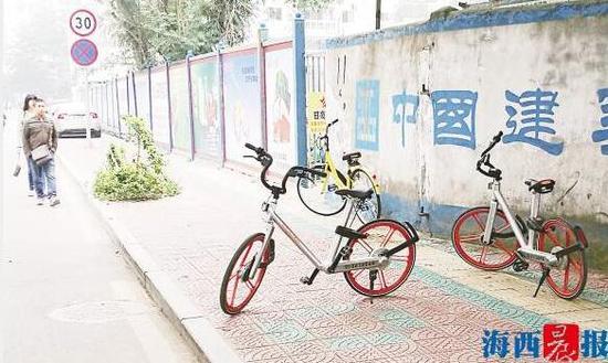 在湖滨北路筼筜路口,3辆共享单车摆了个“三角阵”,几乎堵住整个3米多宽的人行道;湖滨东路湖光路段,一辆“小黄车”随意停在了人行道中间……