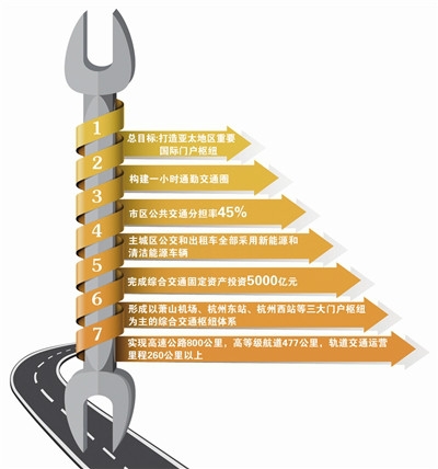记者1月18日从市交通运输局获悉,“十三五”杭州交通蓝图绘就:杭州交通运输将围绕打造亚太地区重要国际门户枢纽这个总目标,重点实施航空拓展工程、轨道成网工程、路网加密工程、水运复兴工程、公交优先工程、枢纽融合工程、绿色智慧工程、产业培育工程。完成综合交通固定资产投资5000亿元,构建一小时通勤交通圈,形成以萧山机场、杭州东站、杭州西站等三大门户枢纽为主的综合交通枢纽体系,实现高速公路800公里,高等级航道477公里,轨道交通运营里程260公里以上,实现市区公共交通分担率45%,主城区公交和出租车采用新能源和清洁能源车辆比例达100%。