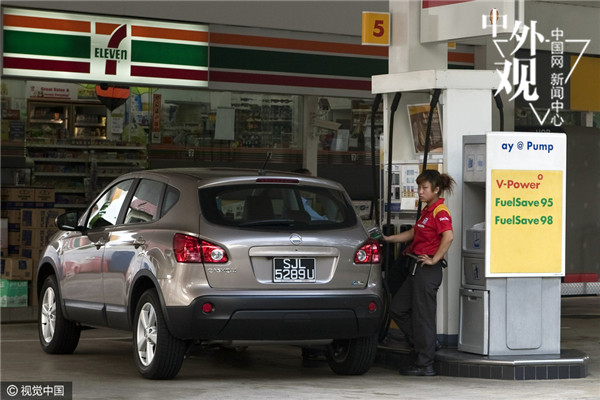 2010年5月24日,新加坡,一辆汽车在加油站加油。为了治理交通拥堵,政府对私人购车环节进行了限制。(Charles Pertwee 视觉中国)