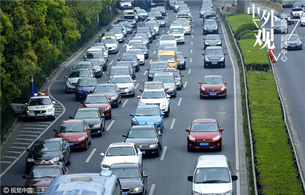 2015年4月16日,上海,全市快速路高架全面更换外牌车辆限行时间,实施更严厉限行方案治理拥堵。(视觉中国)