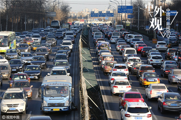 2016年1月14日,北京,受春运影响,北京南站附近路面交通出现严重拥堵。(视觉中国)
