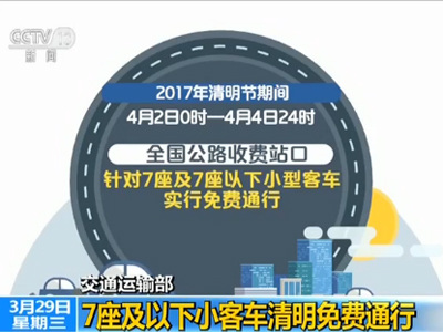 今年清明节期间,从4月2日零时起至4月4日24时,全国公路收费站口针对7座及7座以下小型客车实行免费通行。
