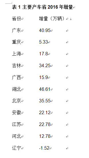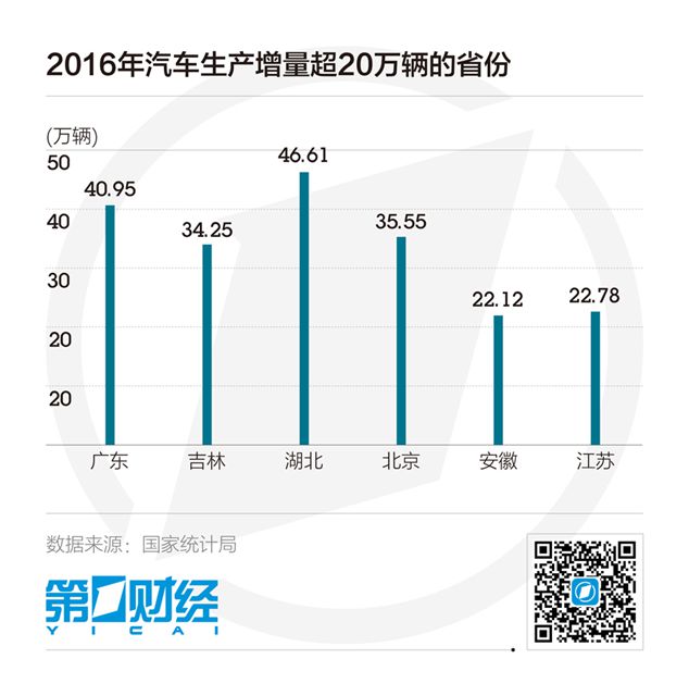 从各省份的增量来看,去年湖北的产量增加最多,增加了46.61万辆,产量排名也从第七升至第六。广东的增量达到40.95万辆,位居第二。此外,北京、吉林增量也超过了30万辆。
