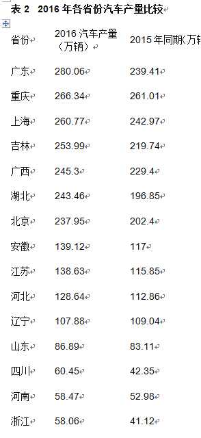 那么哪些地方的产量最高?第一财经记者根据国家统计局公布的数据梳理发现,2016年有7个省份的产量突破了200万大关,其中广东、重庆和上海位居前三,广西也进入到前五。总体来看,有大型汽车集团所在的省份,产量都比较靠前。
