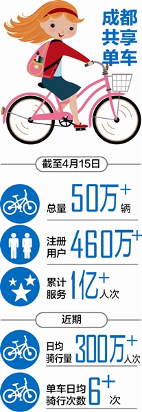 “自2016年11月中旬共享单车进入成都以来,发展迅速,特别是今年入春以后,随着天气转暖,共享单车更是呈井喷式发展。”市交委相关负责人介绍,数据显示,截至4月15日,成都共享单车总量已超过50万辆,注册用户数超过460万,累计服务超1亿人次,近期日均骑行量已超过300万人次,单车日均骑行次数超过6次。