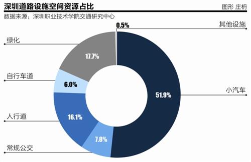 深圳职业技术学院交通研究中心的一项数据指出,深圳目前的道路设施空间资源占比情况,小汽车占51.9%,常规公交占7.8%,自行车道占6%。