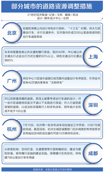 7月10日,杭州市城管委公布《关于做好人行道非机动车泊位施划的工作方案》,其中提出,对城市主要大型住宅区周边以及道路条件具备的开阔人行道,做到应划尽划。北京、成都等地则分别提出了构建自行车道的具体里程规划。