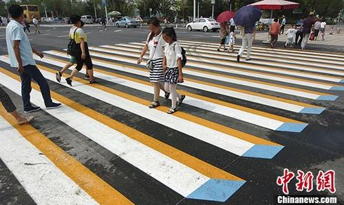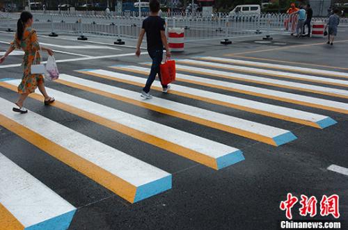 7月31日,市民在3D立体交通斑马线上行走。 中新社记者 佟郁 摄