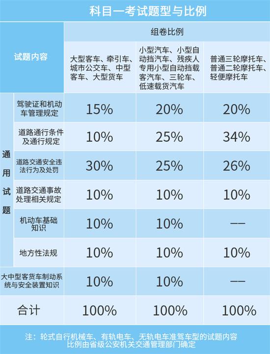 同时,调整试题比例。科目三安全文明驾驶常识考试(共8个项目)中的 安全行车常识、 文明行车常识、 恶劣气象和复杂道路条件下安全驾驶知识占比分别为20%、18%和16%。