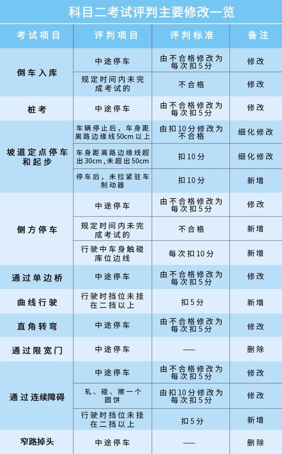 科目二考试评判主要修订内容: 修改了“在规定时间内未完成倒车入库考试的,评判为不合格”等10个评判项目; 新增了“在坡道定点停车后,未拉紧驻车制动器的,扣10分”等5个评判项目; 删除了“通过限宽门、窄路掉头项目中途停车”2个评判项目。
