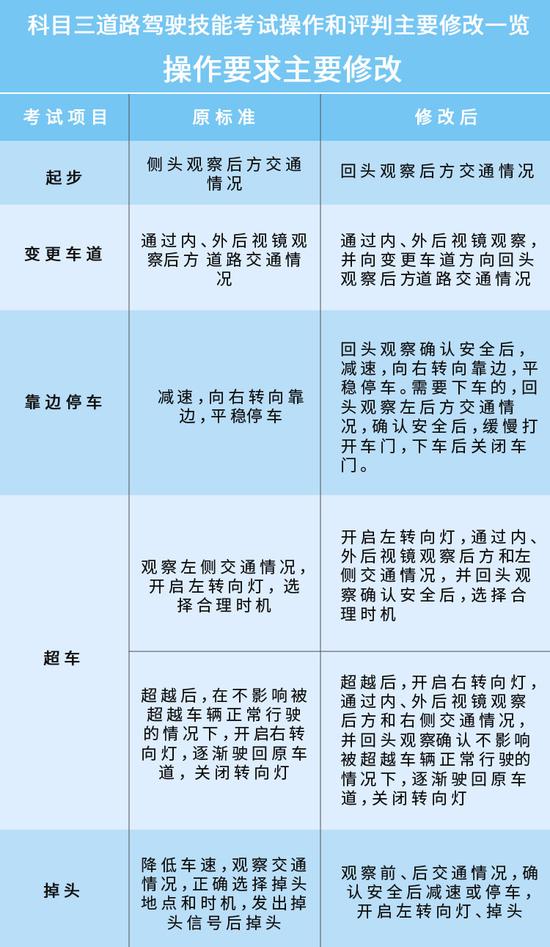科目三考试操作和评判主要修订内容:在路考操作和评判中,“起步、变更车道、靠边停车、超车”项目增加了“回头观察”动作;“直行通过路口、路口左右转弯,不主动避让优先通行车辆、行人、非机动车的,评判为不合格”,从操作细节动作考核考生安全文明意识。