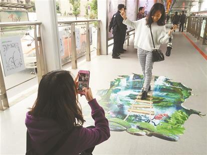 图为:17日,静安路BRT站点文化长廊竣工,有3D地贴画、缤纷的彩灯和古诗词,带给乘客不一样的体验通讯员倪望明、苏丹丹、杨红、康先军摄