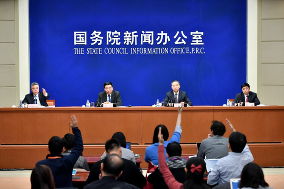 1月30日,国新办举行新闻发布会,请工业和信息化部部长苗圩,工业和信息化部副部长辛国斌,工业和信息化部总工程师、新闻发言人张峰介绍2017年工业通信业发展情况,并答记者问。 新华社记者 李鑫 摄