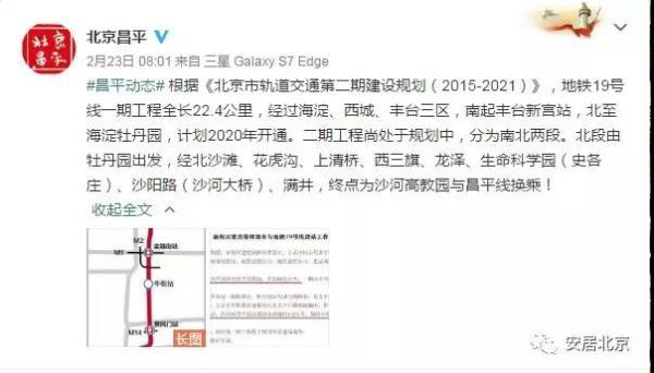 昌平区官方政务微博“北京昌平”于2月23日发布了关于19号线的最新消息并在回复网友关于“19号线二期北延”的问题时表示“已在规划中”。同时,此线路与新机场线将在草桥站实现换乘,乘客再花20分钟左右时间就可以抵达新机场。