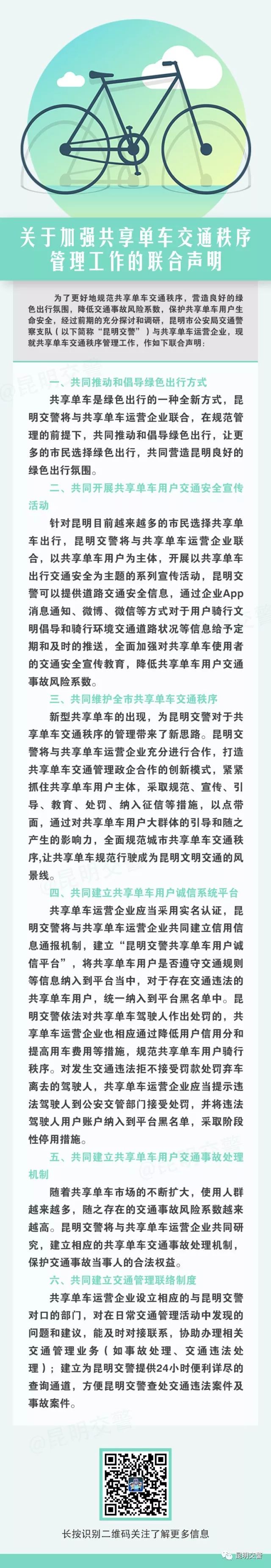 在要求和规范企业的同时,昆明交警也呼吁广大市民在使用共享(公共)自行车时文明用车、安全骑行。