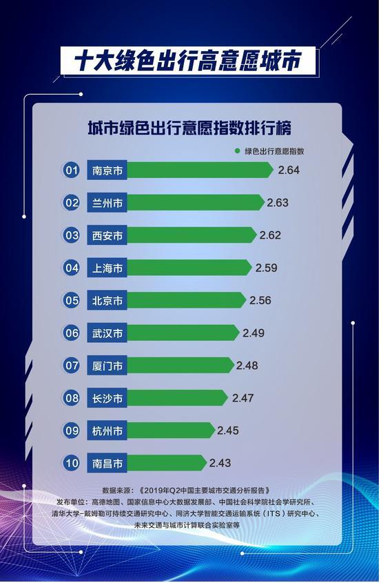 《报告》发布了“绿色出行意愿指数”,南京指数最高,而在各类绿色出行方式中,北京“公交&地铁出行意愿指数”排名第一,南宁“骑行出行意愿指数”排名第一,兰州“步行出行意愿指数”排名第一。